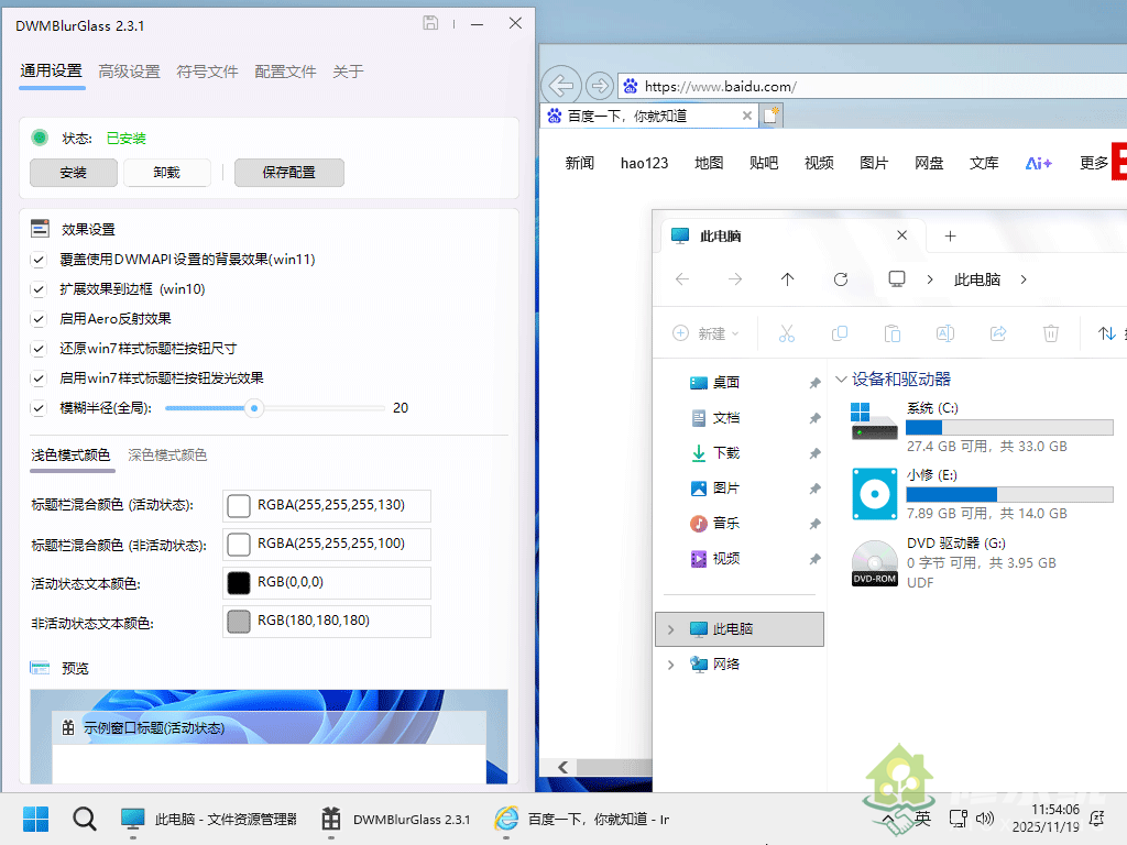安装时只需把 GitHub releases 中的压缩包解压到 Program Files,运行 DWMBlurGlass.exe → 点击“安装” → 在“符号”页下载微软符号 → 在“高级/模糊方法”里选 CustomBlur 或 Aero → 保存即可实时看到半透明玻璃效果